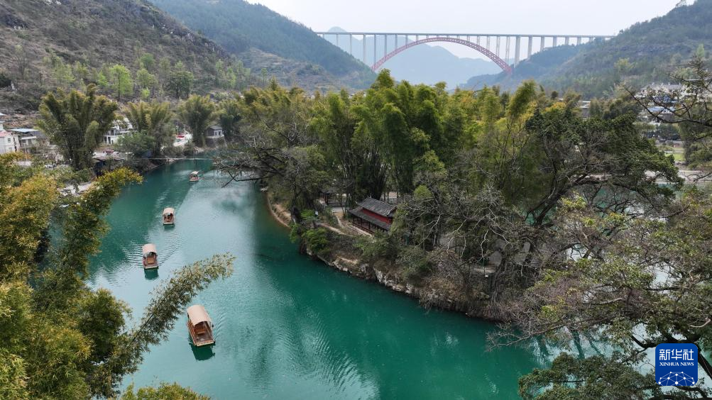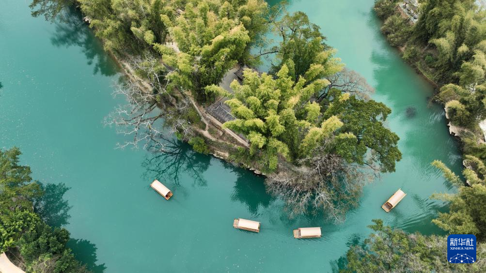 3月7日,游客在大井村大小井景区乘竹筏游览。新华社发(范晖 摄)pagebreak