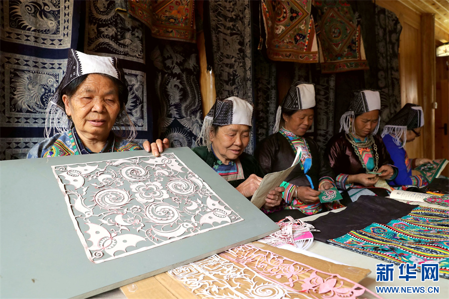 3月6日,在贵州省黔东南苗族侗族自治州榕江县三江乡冷衣村,苗族妇女在展示剪纸。新华网发(李长华 摄)pagebreak