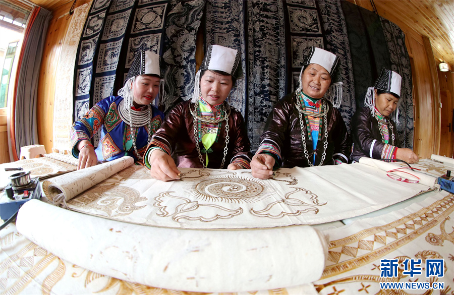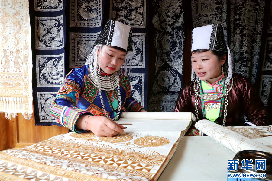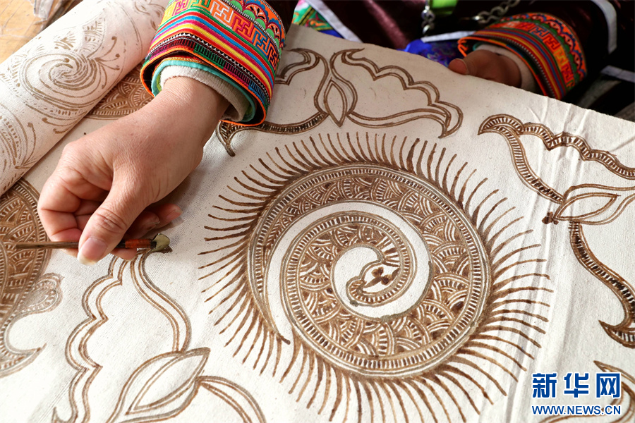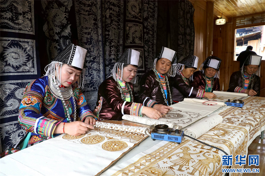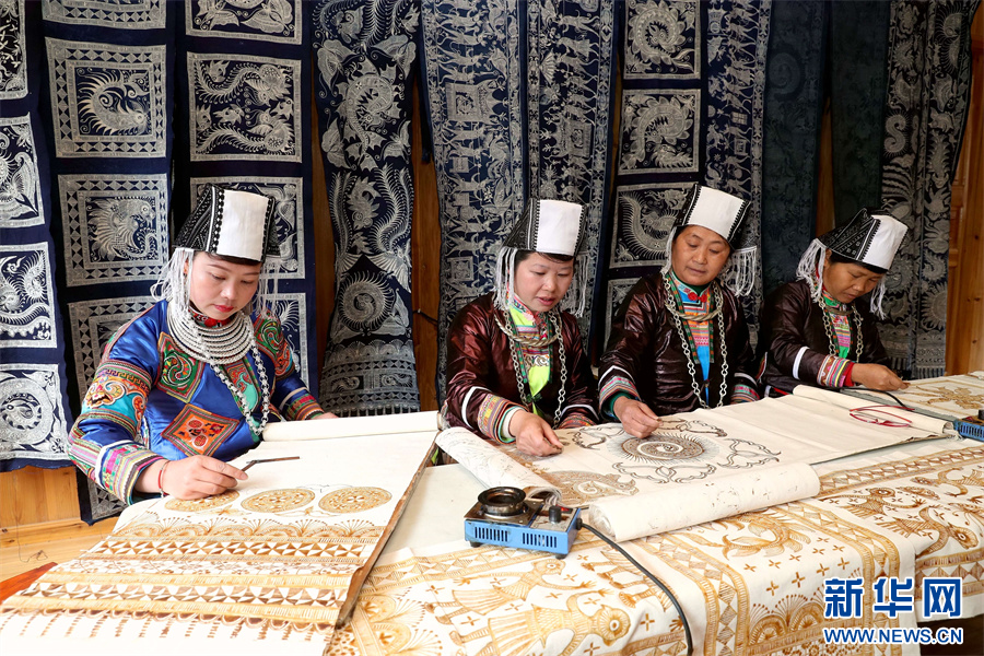 3月6日,在贵州省黔东南苗族侗族自治州榕江县三江乡冷衣村,苗族妇女在画蜡画。新华网发(李长华 摄)
