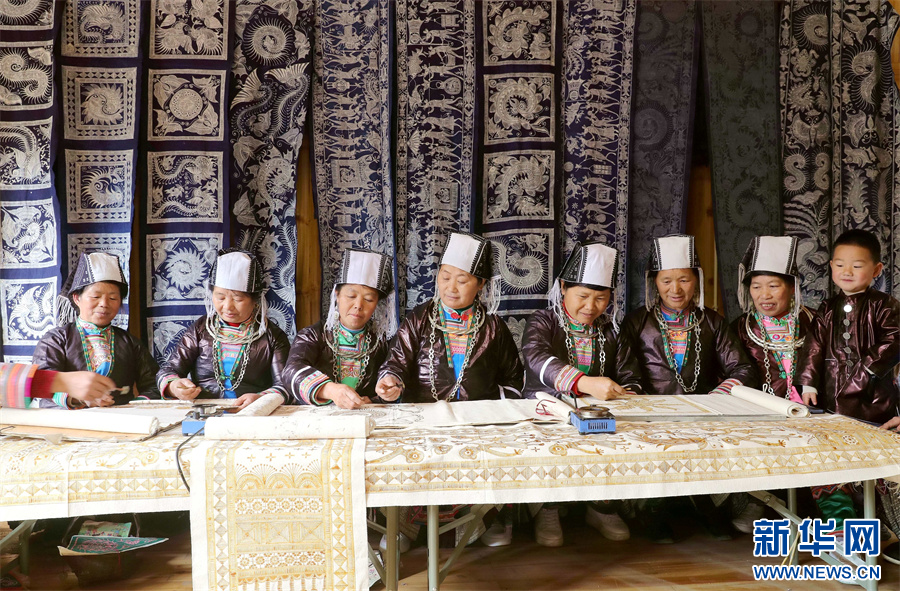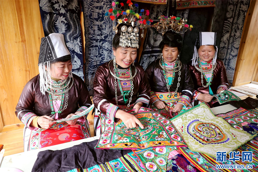 3月6日,在贵州省黔东南苗族侗族自治州榕江县三江乡冷衣村,苗族妇女在切磋刺绣技艺。新华网发(李长华 摄)pagebreak