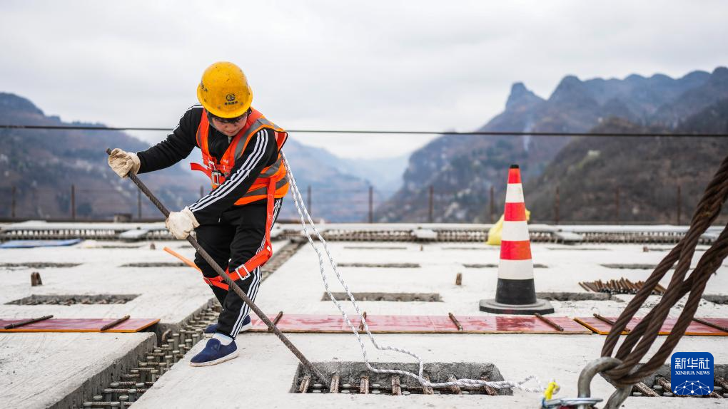 3月19日,贵州交建集团工人在白水河大桥桥面进行施工。新华社记者 陶亮 摄