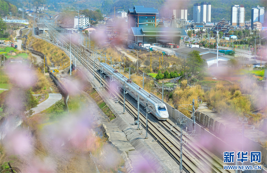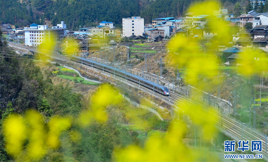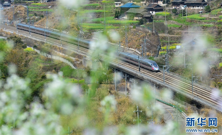 3月19日,一列动车组列车在贵广高铁贵州省从江县洛香镇段附近行驶。