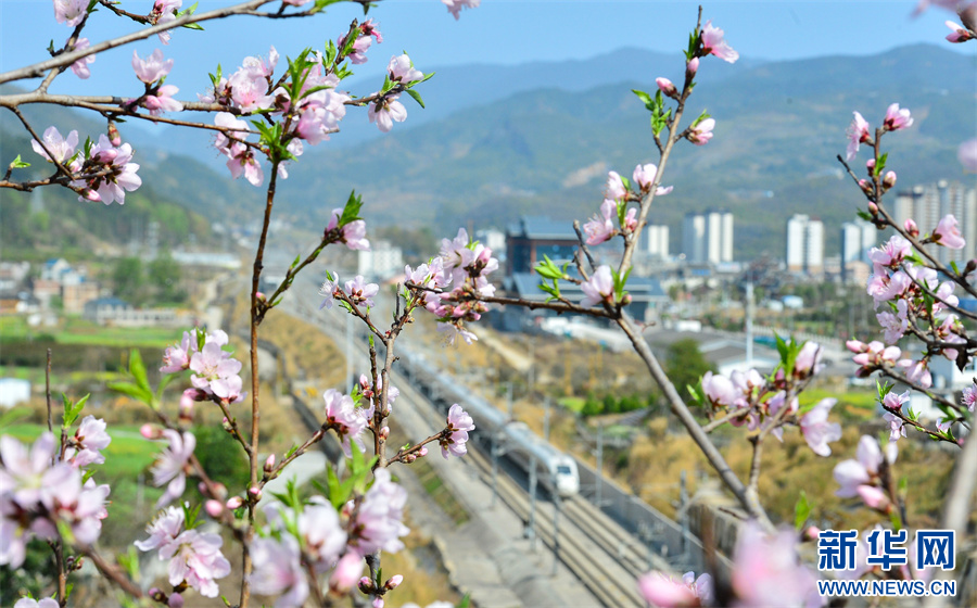仲春时节,贵州省黔东南苗族侗族自治州从江县境内的油菜花、桃花、李花等陆续开放,动车组列车穿行其间,美不胜收。