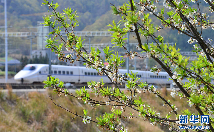 3月19日,一列动车组列车在贵广高铁贵州省从江县洛香镇段附近行驶。新华网发(卢忠南 摄)