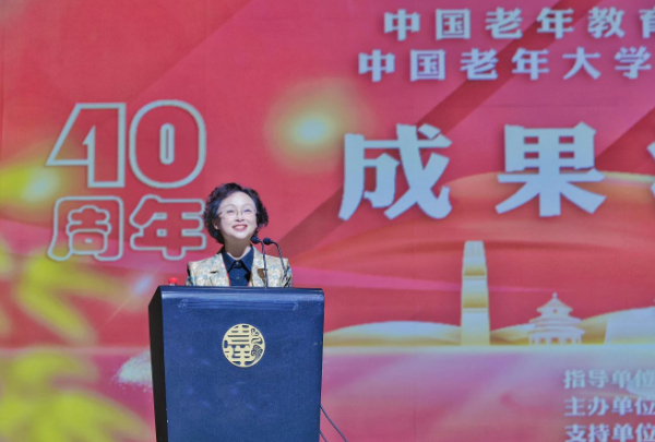 (图为:2023年10月26日龙丽红同志在北京中国老年教育发展40周年成果汇报会上作交流发言)
