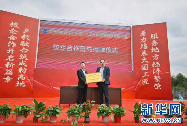 新华网贵阳3月29日电(黄勇)黔南州中德技工学校28日在学校与比亚迪股份有限公司签署校企合作协议,挂牌建立比亚迪校企合作实训基地和比亚迪新能源汽车实训基地,在人才培养、科研创新、实习实训等方面进行合作。