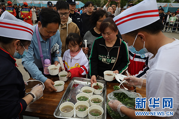 市民们正在排队领取牛汤锅。新华网(梁艺 摄)