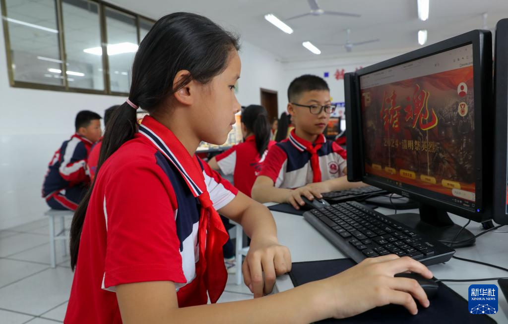 4月1日,在贵州省贵阳市开阳县第一小学,学生通过网络祭奠先烈。