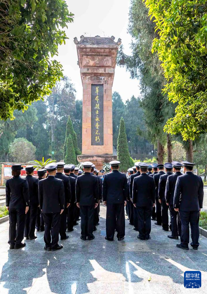 4月3日,民警在贵州省黔西市烈士陵园英雄纪念碑前开展祭扫活动。新华社发(范晖摄)