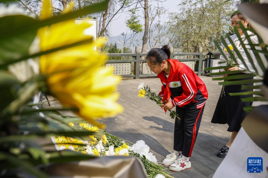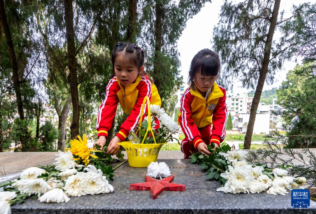 4月3日,学生在贵州省黔南布依族苗族自治州罗甸县烈士陵园向烈士敬献鲜花。新华社发(史传鸿摄)pagebreak
