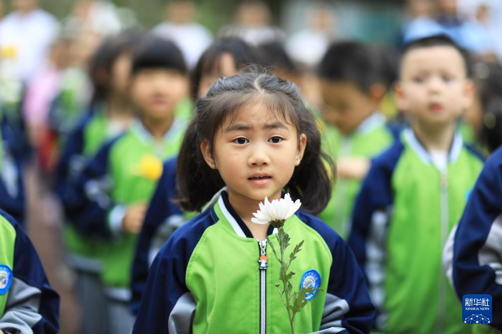 4月3日,在贵州省赤水市红军烈士陵园,小朋友手捧鲜花向英烈致敬。新华社发(王长育摄)pagebreak