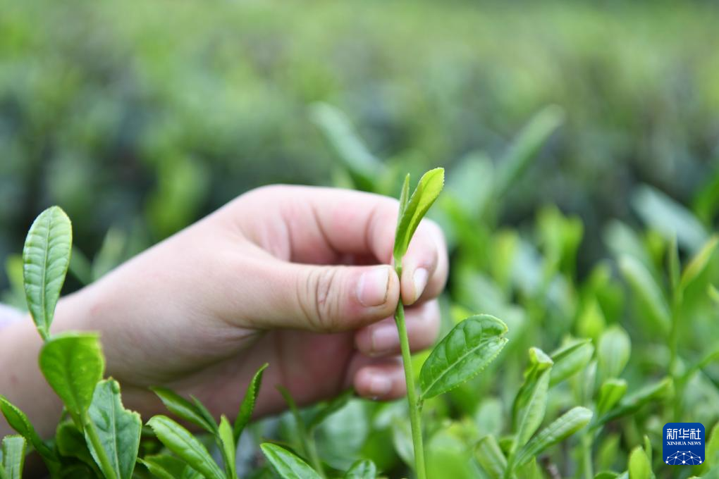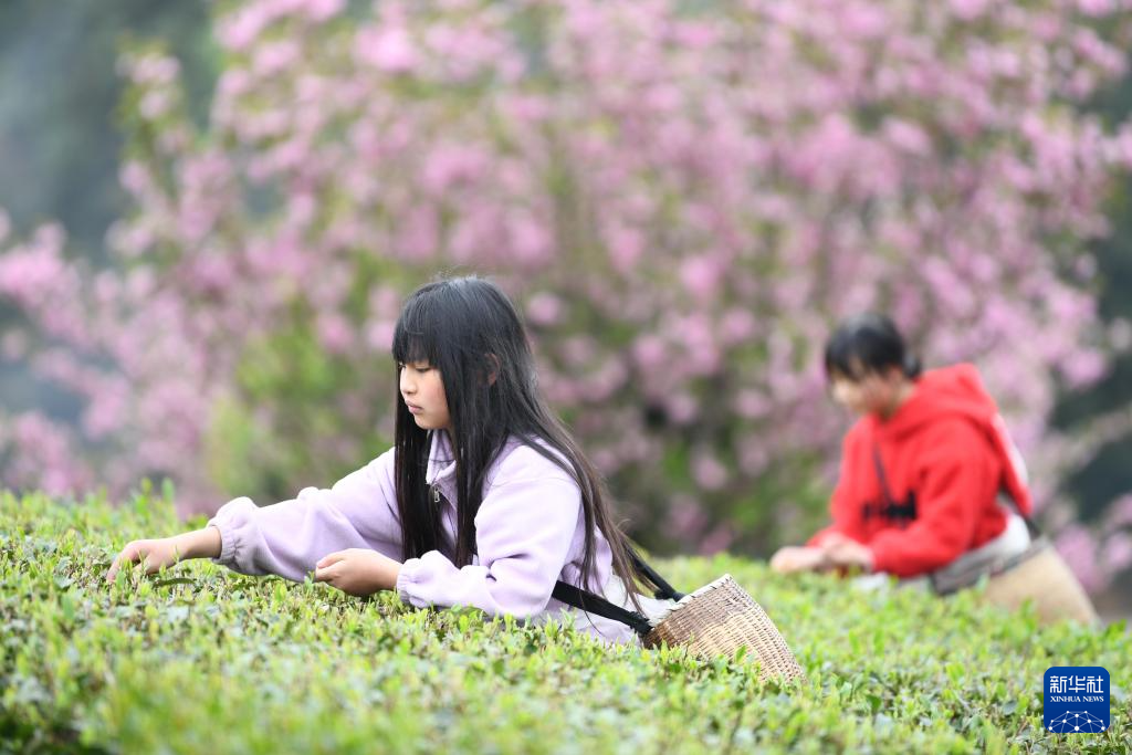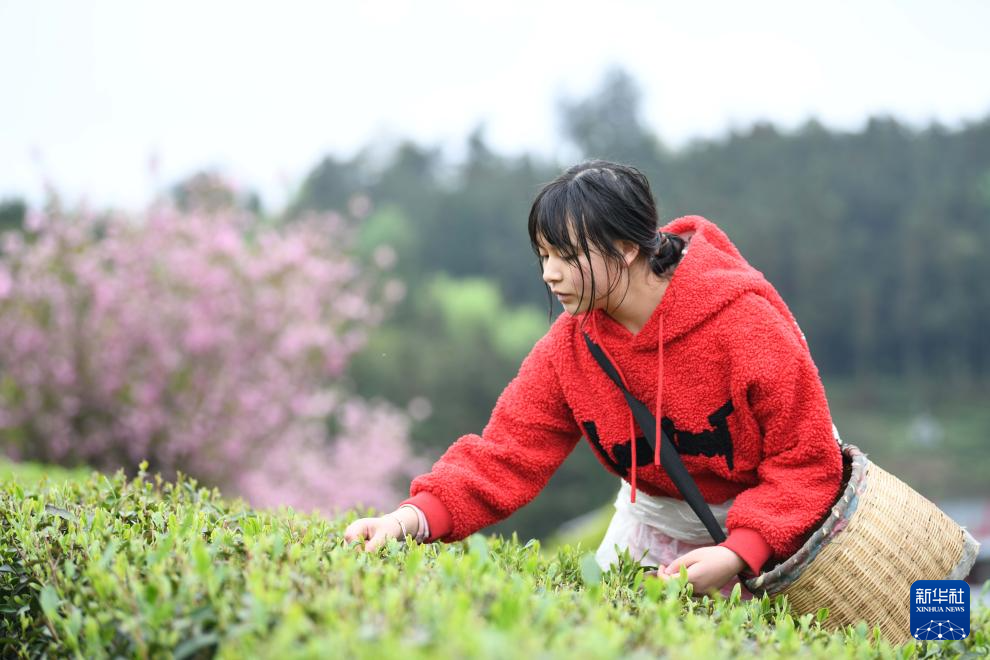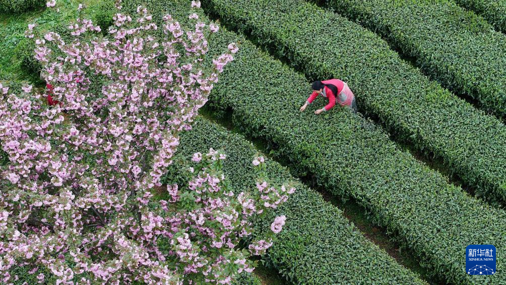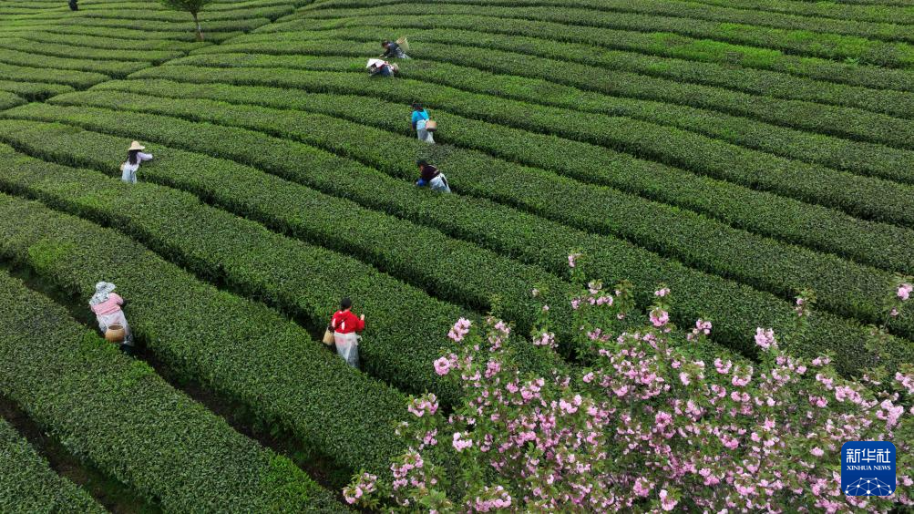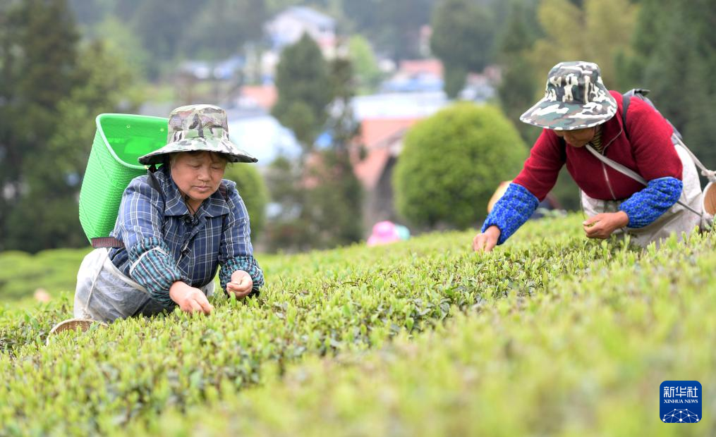 4月5日,村民在贵州省遵义市余庆县松烟镇二龙村茶场采摘春茶。新华社发(贺春雨 摄)pagebreak