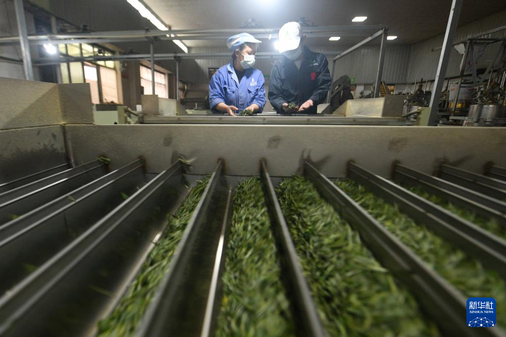 4月5日,工人在贵州省遵义市余庆县松烟镇二龙村茶场加工车间加工春茶。新华社发(梁文 摄)pagebreak