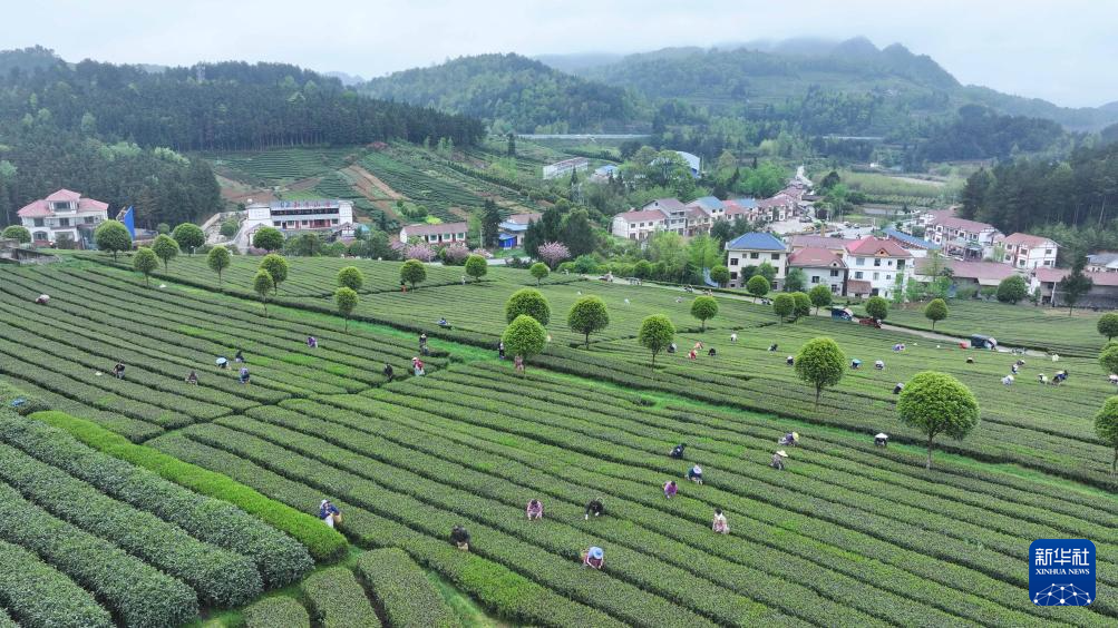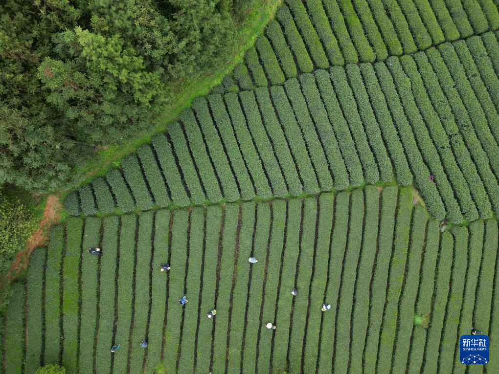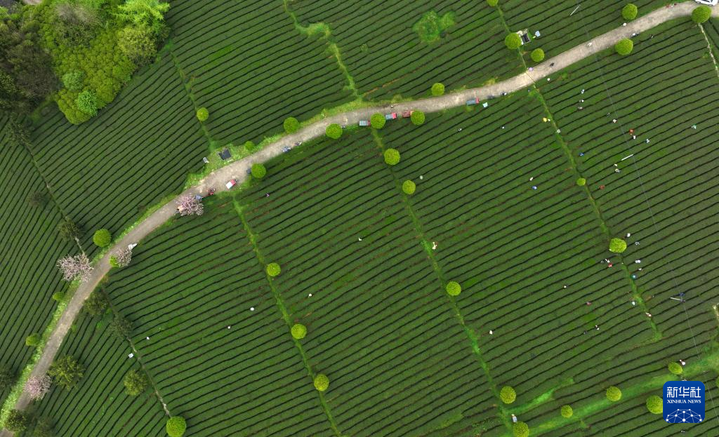 4月5日,村民在贵州省遵义市余庆县松烟镇二龙村茶场采摘春茶(无人机照片)。新华社发(王超 摄)pagebreak