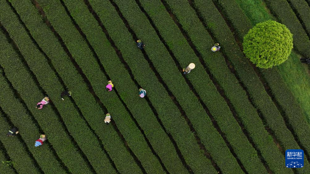 4月5日,村民在贵州省遵义市余庆县松烟镇二龙村茶场采摘春茶(无人机照片)。新华社发(贺春雨 摄)pagebreak