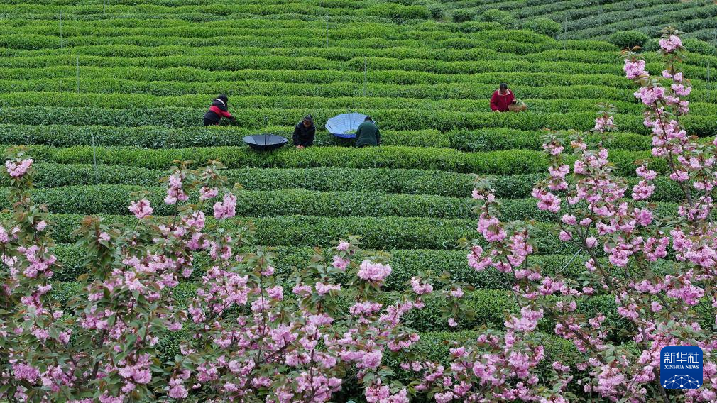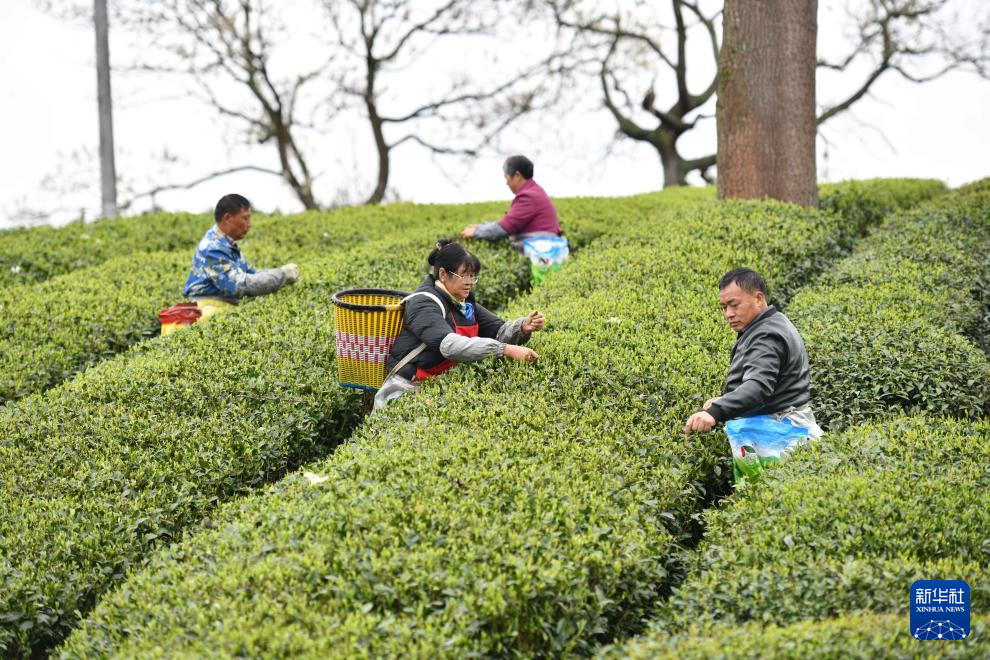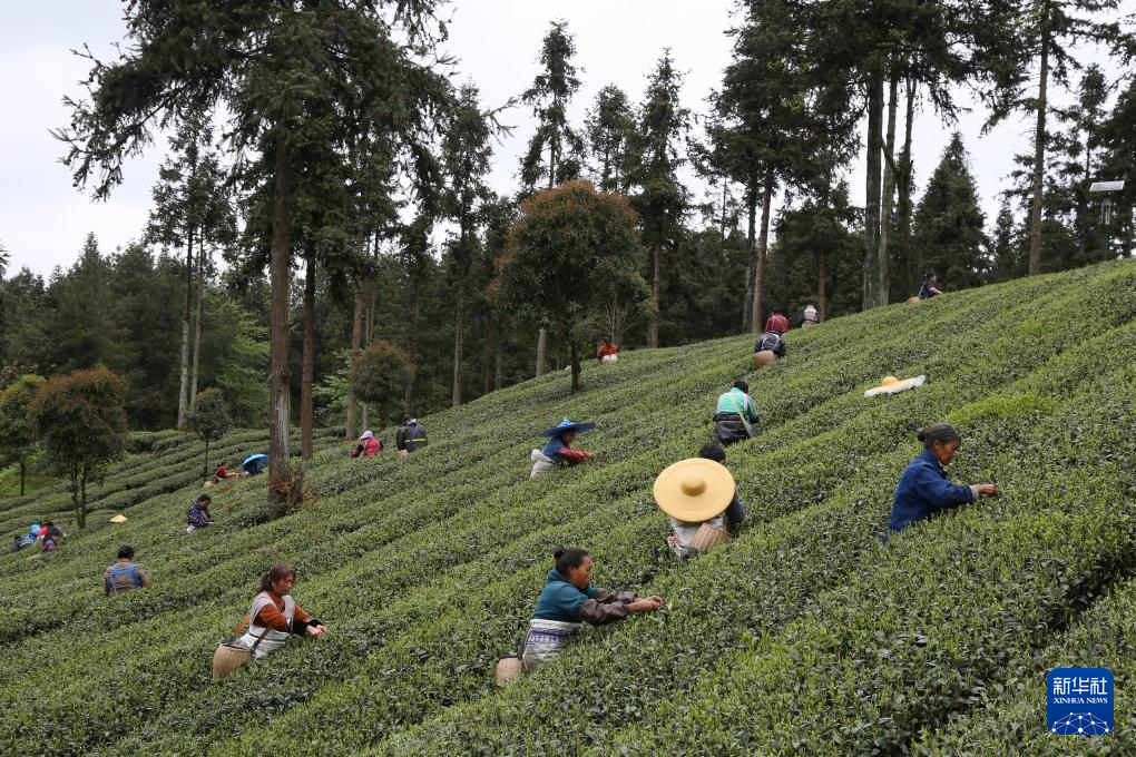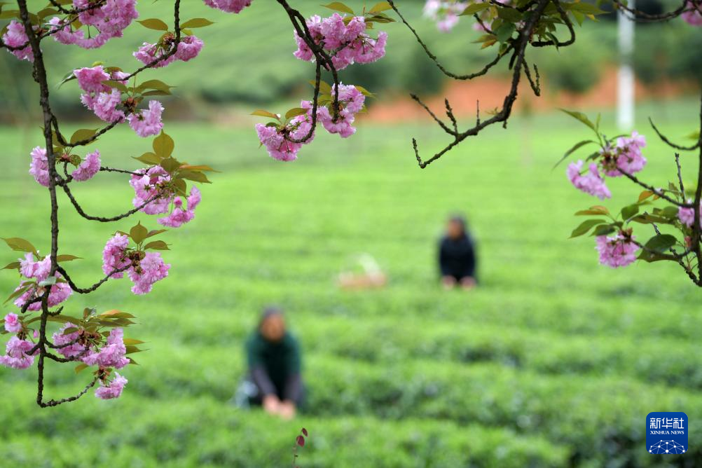 4月6日,村民在凤冈县永安镇田坝社区茶叶基地采摘春茶。新华社发(饶云 摄)