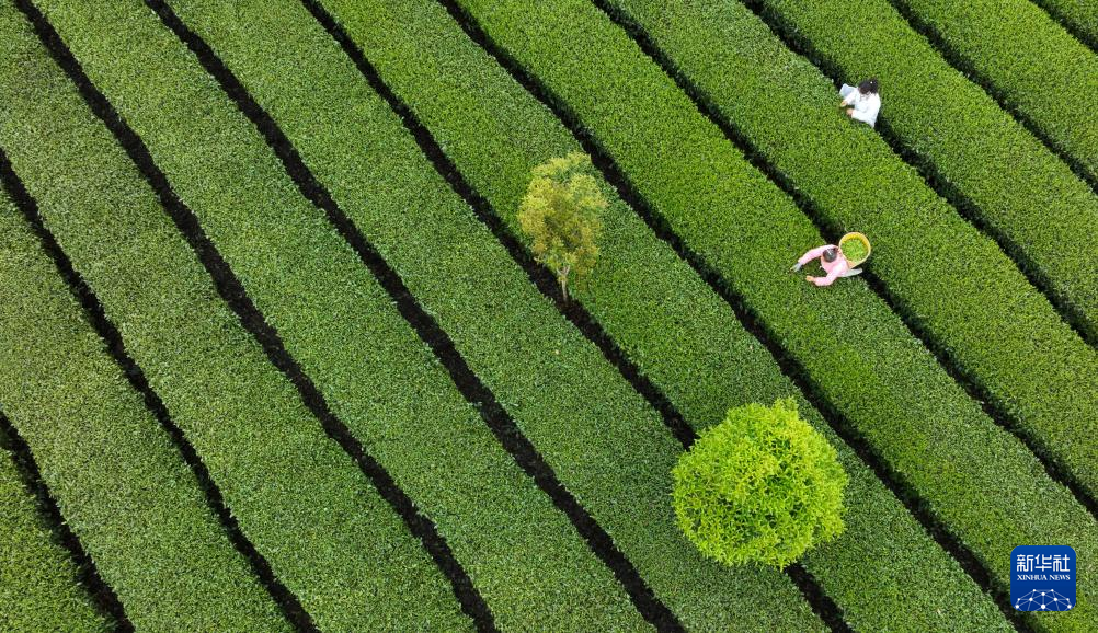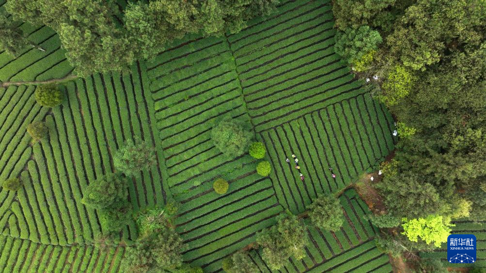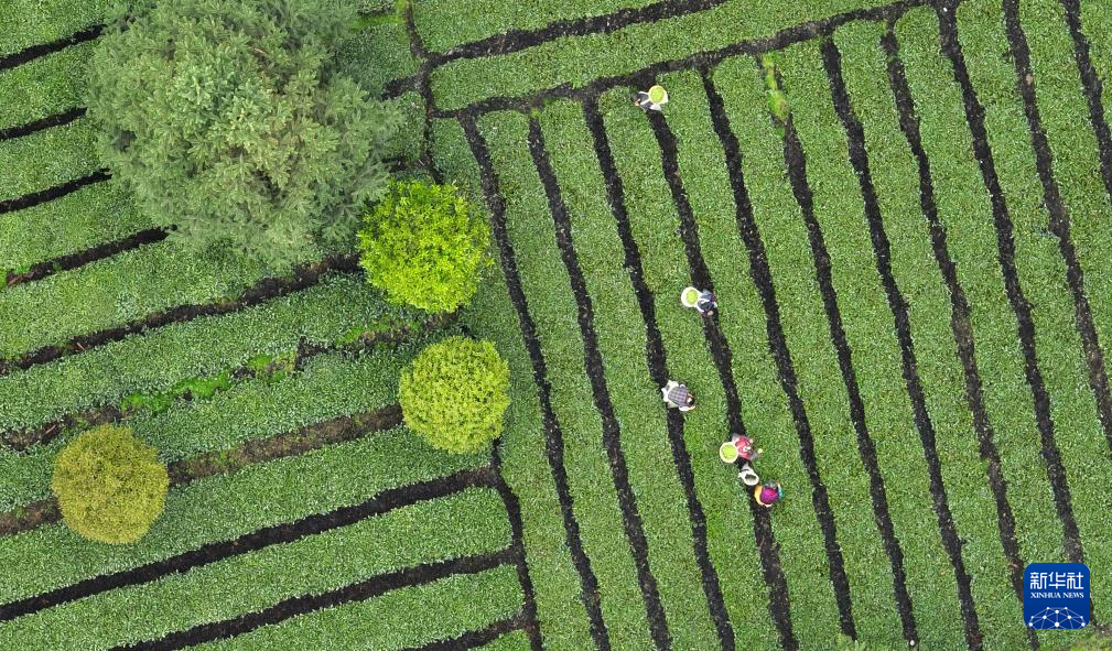 4月6日,村民在凤冈县永安镇田坝社区茶叶基地采摘春茶(无人机照片)。新华社发(王超 摄)pagebreak