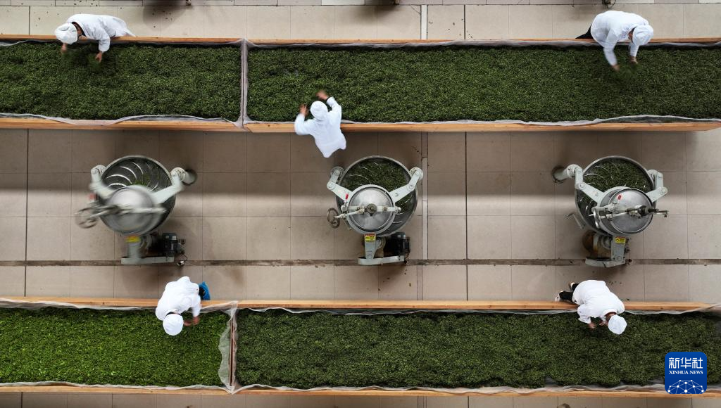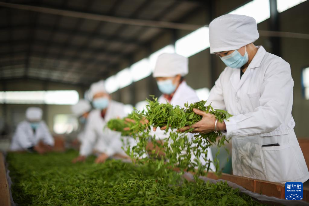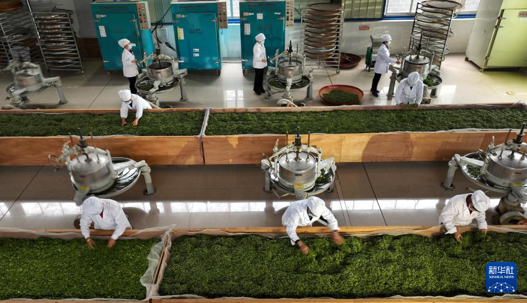 4月10日,工人在贵州省丹寨县金钟经济开发区一家茶企的生产车间摊晾茶青。新华社发(杨武魁 摄)