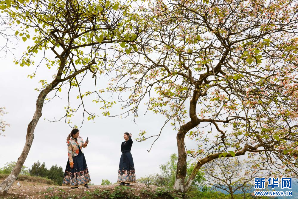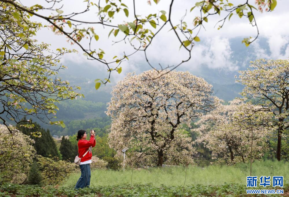 游客在贵州省正安县和溪镇大坎社区桐花岭赏花拍照。新华网发(赵永章 摄)pagebreak