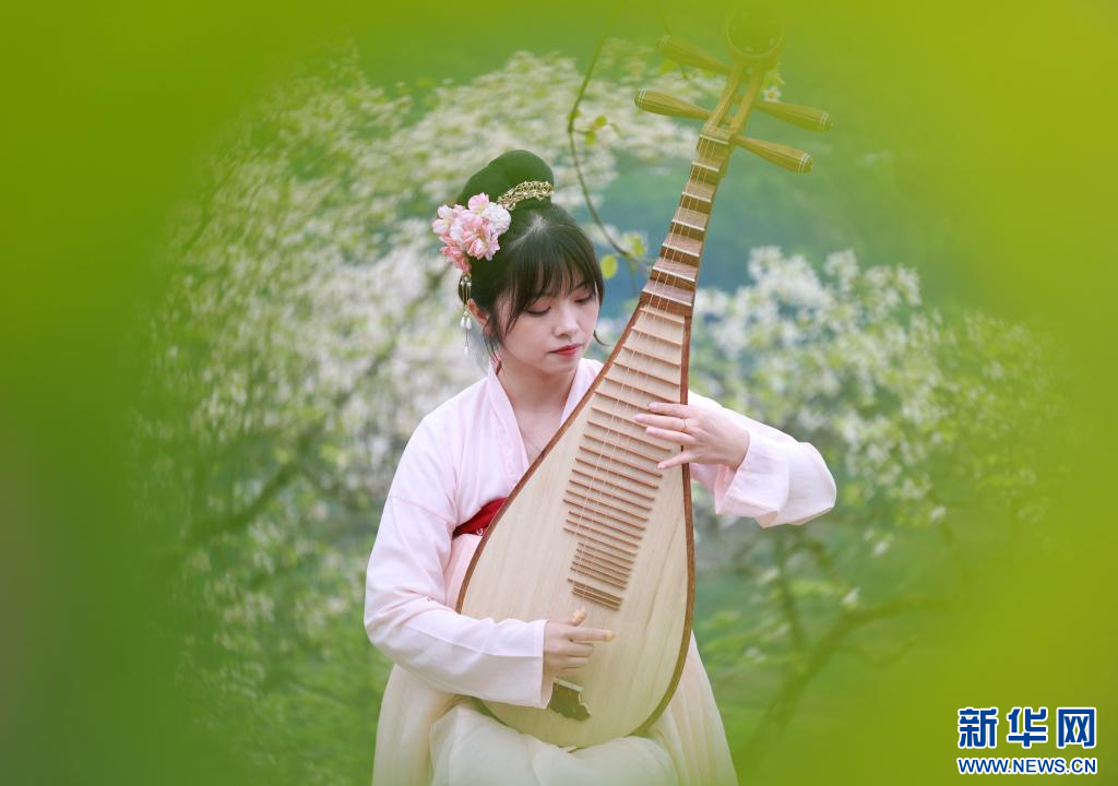 一名女子在贵州省正安县和溪镇大坎社区桐花岭弹奏琵琶。新华网发(赵永章 摄)pagebreak