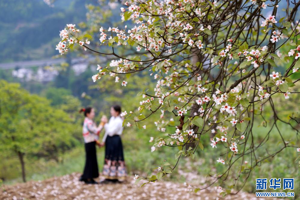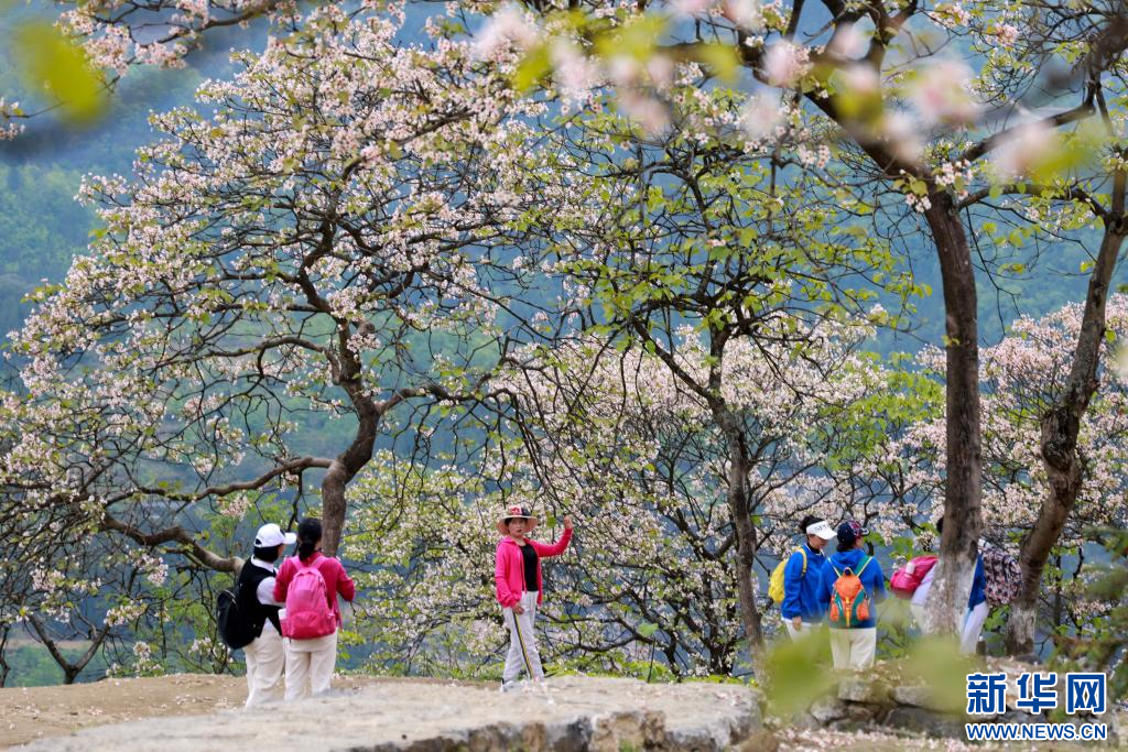 游客在贵州省正安县和溪镇大坎社区桐花岭游玩。新华网发(赵永章 摄)