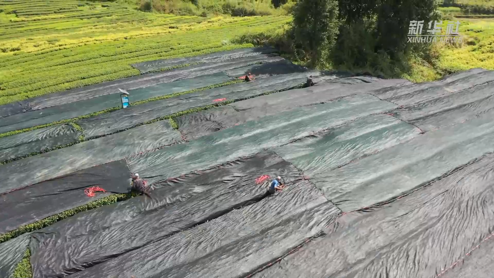 世界自然遗产地梵净山脚下的贵州省江口县,有“中国抹茶之都”美誉。随着春日气温逐渐增加,江口县3万亩抹茶基地里,茶农正忙着用遮阳网将茶树盖上一层薄膜。