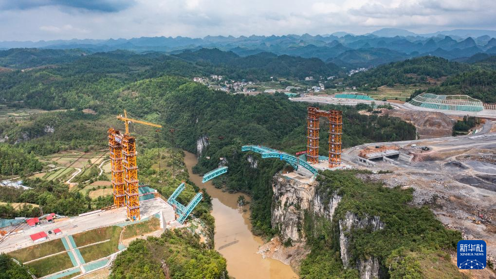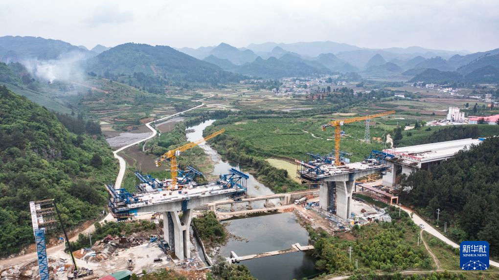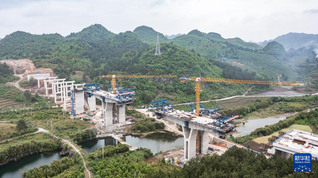 4月17日拍摄的建设中的贵平高速摆龙河大桥(无人机照片)。新华社记者 陶亮 摄