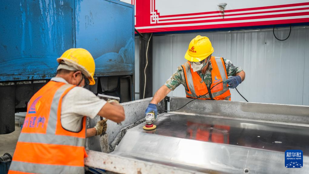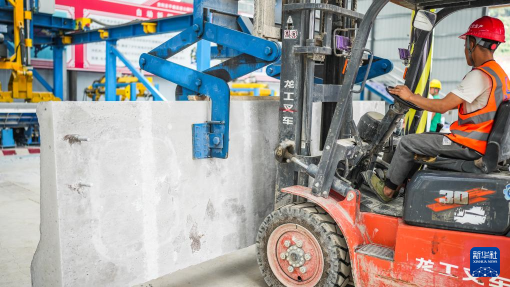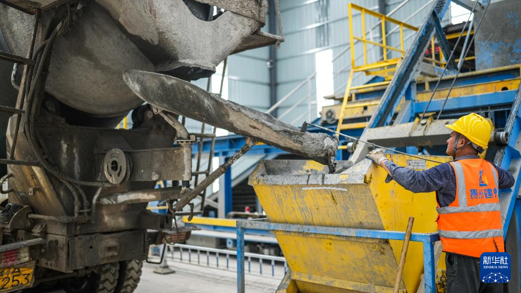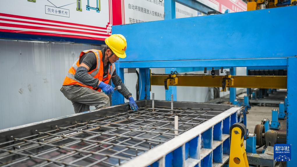 4月18日,工人在贵平高速护栏智能化预制场内施工。新华社记者 陶亮 摄