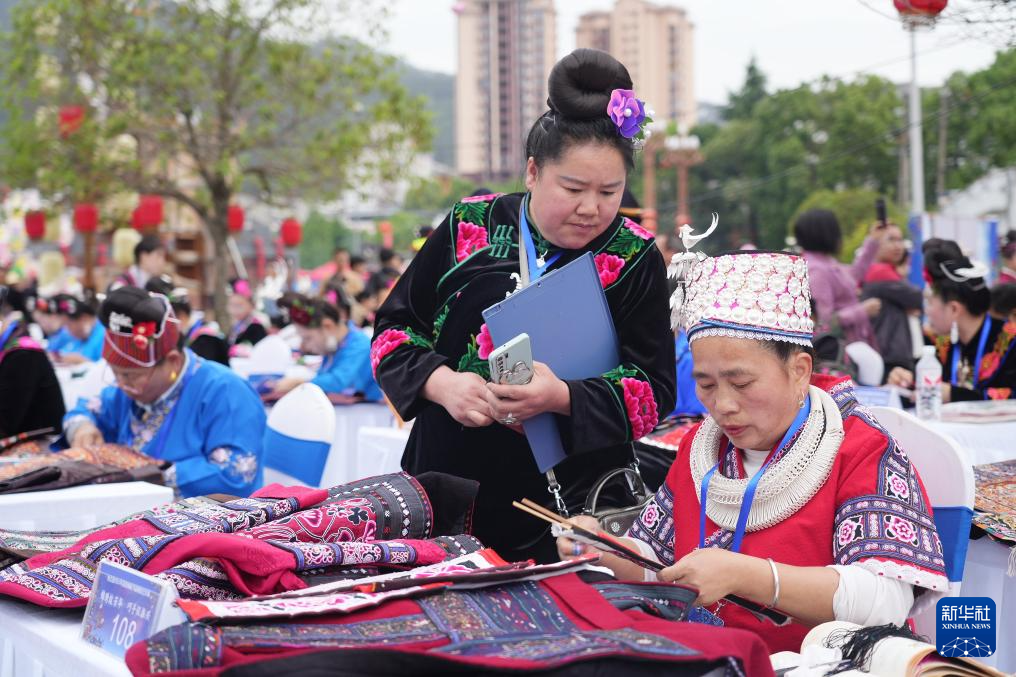 4月21日,苗族妇女在台江县参加苗族刺绣大赛。新华社发(邰春摄)pagebreak