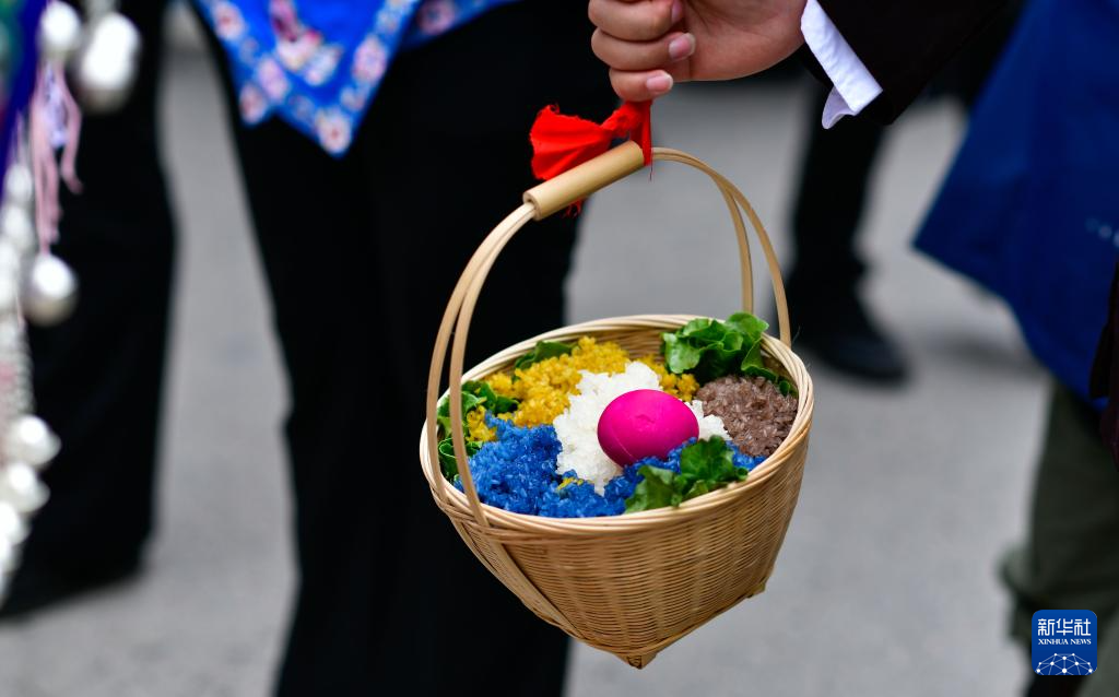 4月21日,苗族群众挑着姊妹饭和鸡蛋参加苗族姊妹节盛装游演。新华社记者 杨文斌 摄pagebreak