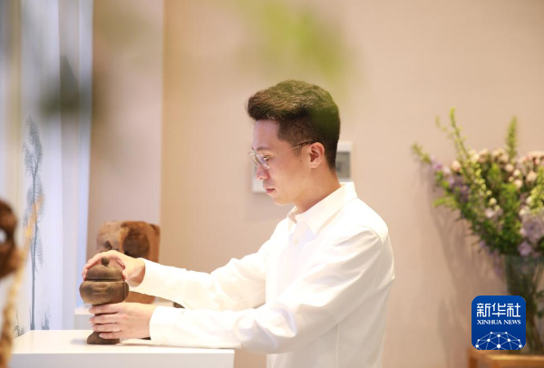 新华社贵阳4月26日电(记者周宣妮)在贵州省清镇市茶马古镇,33岁的刘子赟正在整理展柜上的茶叶和沉香工艺品,并向前来参观的游客进行介绍。古色古香的陈设,丰富而古朴的茶具及香具,营造出一个舒适而静谧的品茗空间。