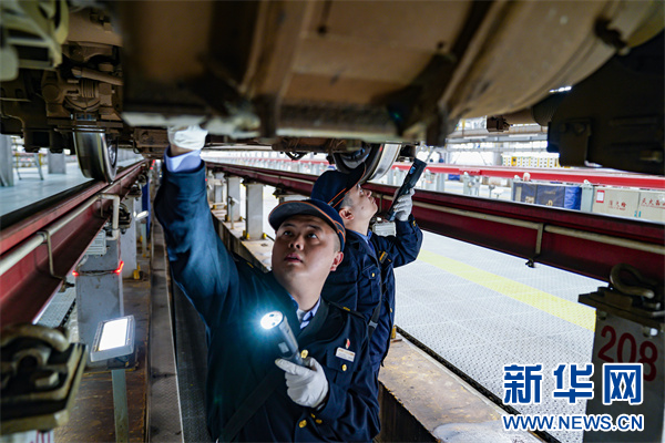图为动车组机械师在检查动车组车钩。新华网发(杨杰文 摄)
