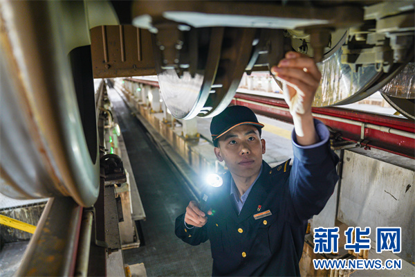 图为动车组机械师在进行动车组车底部件检查。新华网发(杨杰文摄)