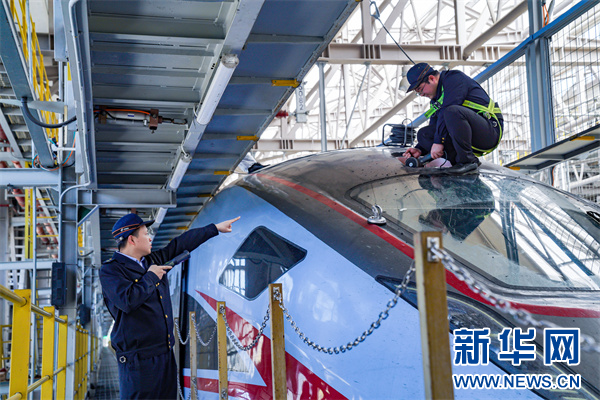 图为动车组机械师在检查动车组天线。新华网发(杨杰文 摄)