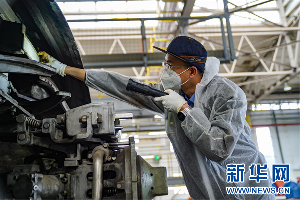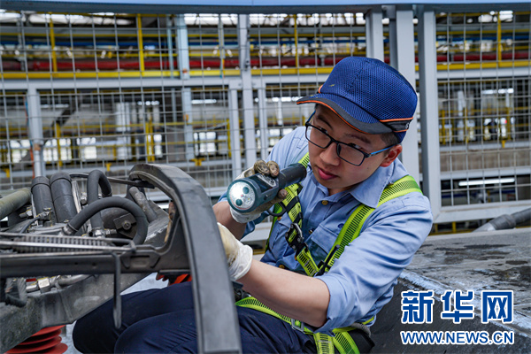 图为动车组机械师在进行动车组受电弓检查。新华网发(杨杰文 摄)