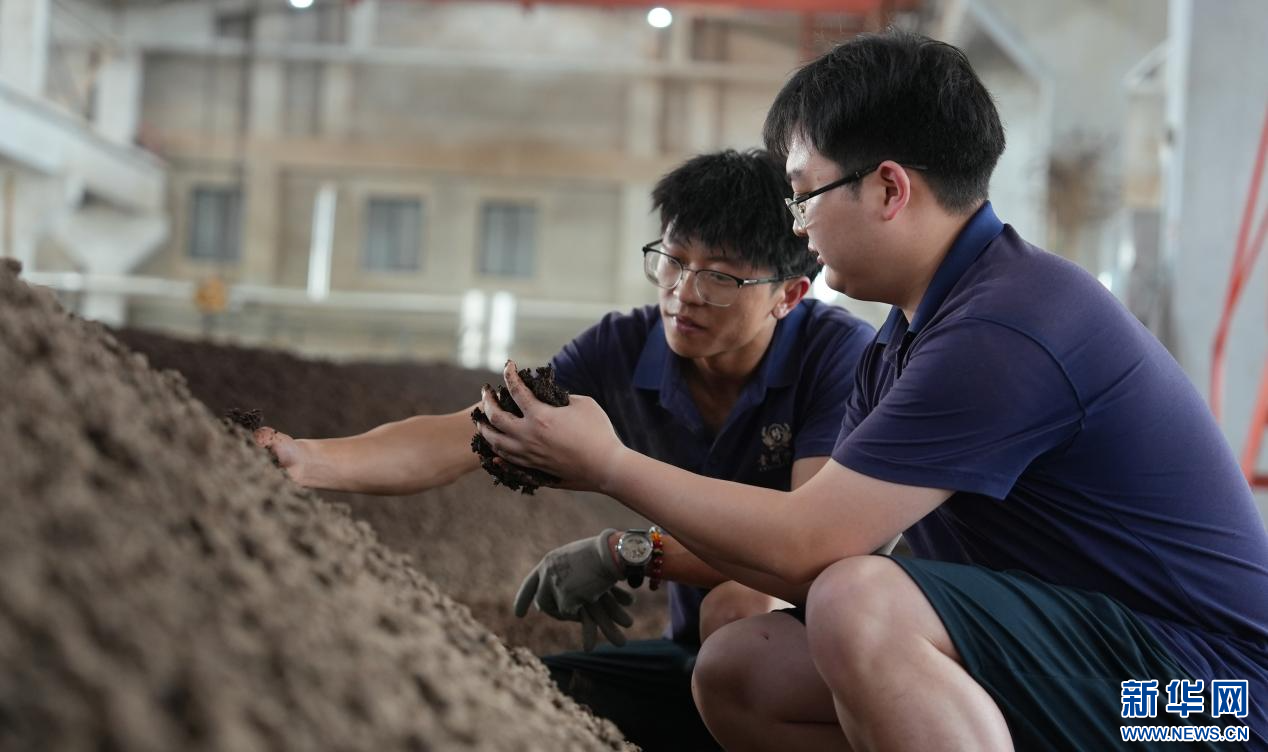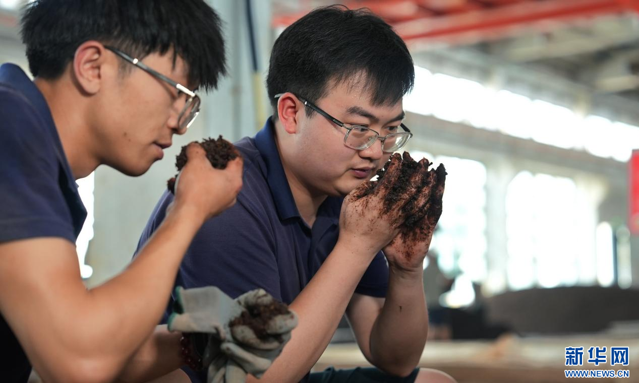 4月29日,贵州珍酒的制曲工人在查看曲料含水量,酱香型白酒所用的大曲是以小麦为原料自然发酵而成。