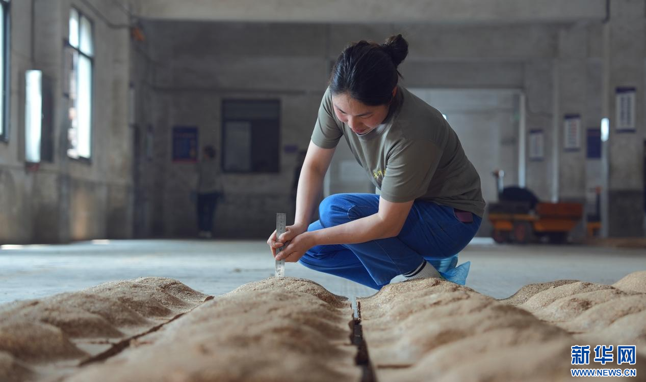 4月29日,制曲工人用尺子测量大曲“龟背”高度。新华网 卢志佳 摄