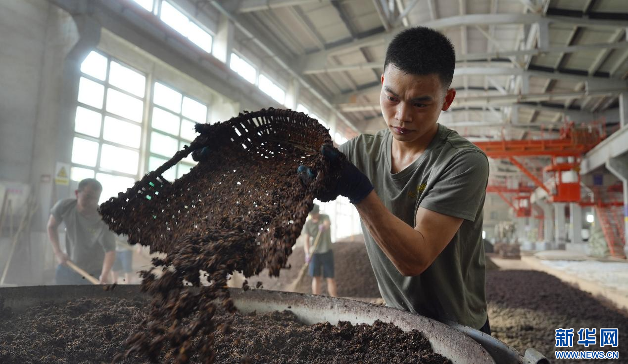 4月29日,贵州珍酒的酿酒工人在进行上堆操作,高温堆积发酵是大曲酱香白酒酿制所独有的工艺。新华网 卢志佳 摄