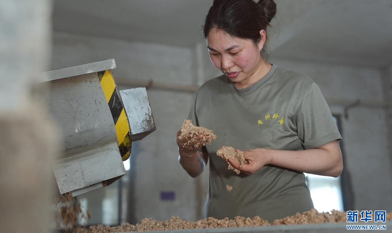 4月29日,制曲工人用手把曲料捏成团,通过观察成团的状态就能准确掌握曲料含水情况。新华网 卢志佳 摄