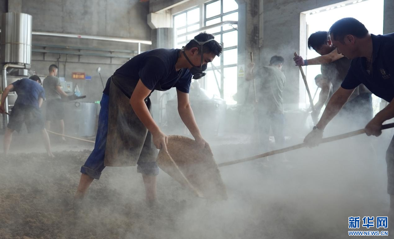 4月29日,贵州珍酒的酿酒工人在进行上甑操作。新华网 卢志佳 摄
