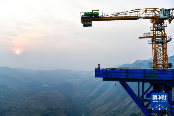 3月26日,一名工程师在花江峡谷大桥的桥塔上查看桥梁建设进度。新华社记者 杨文斌 摄