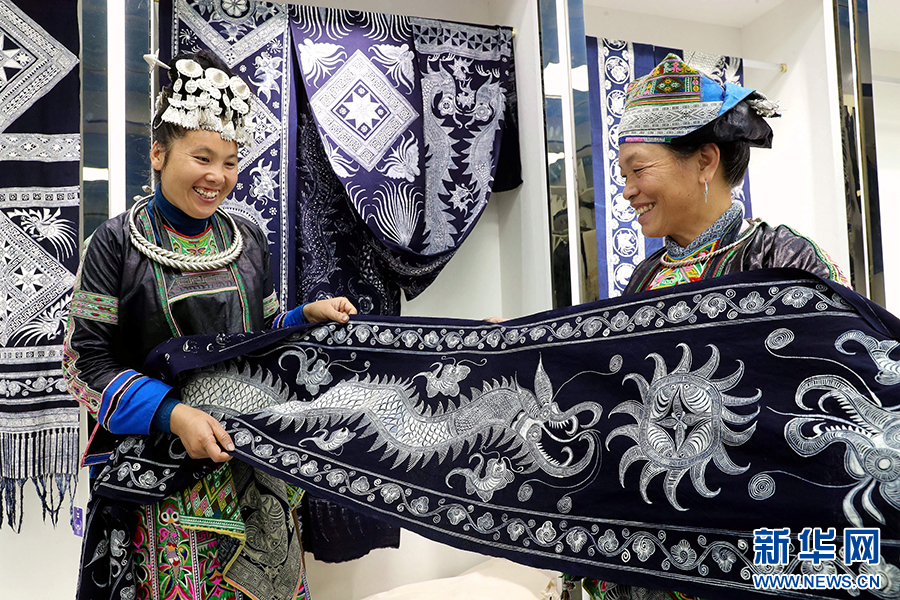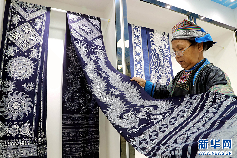 5月8日,在贵州省黔东南苗族侗族自治州榕江县兴华水族乡摆贝苗寨,苗族妇女在展示蜡染产品。新华网发(李长华 摄)pagebreak