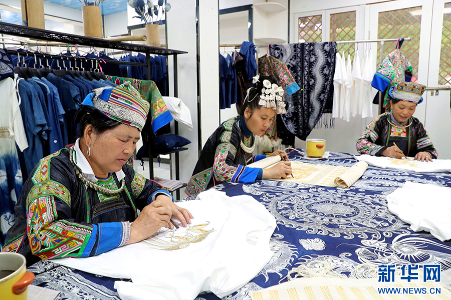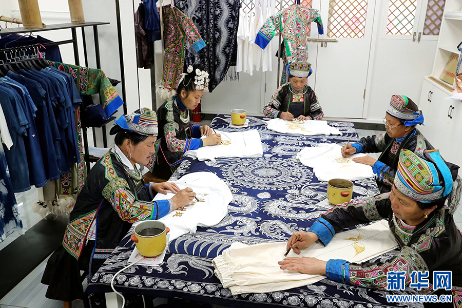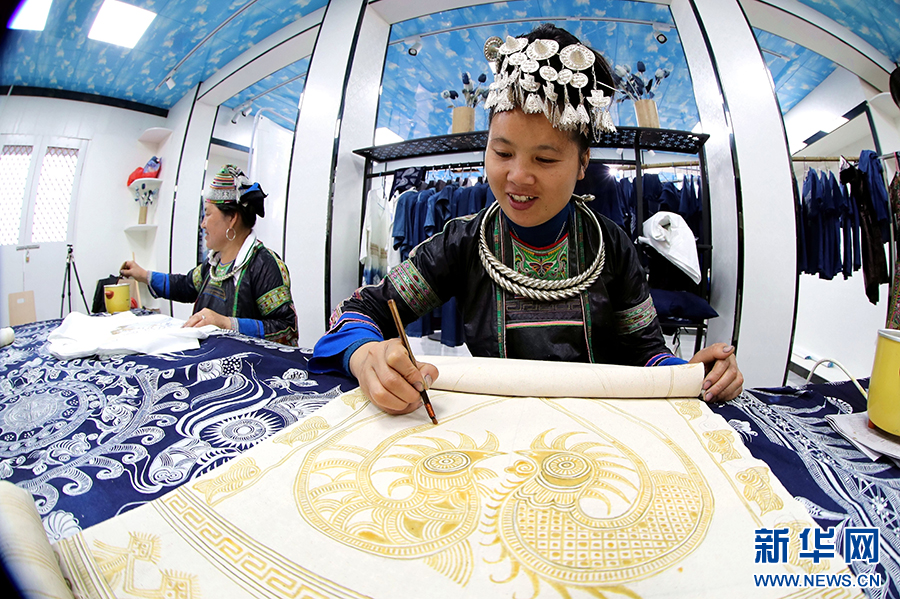 5月8日,在贵州省黔东南苗族侗族自治州榕江县兴华水族乡摆贝苗寨,苗族妇女在赶制蜡染订单。新华网发(李长华 摄)pagebreak