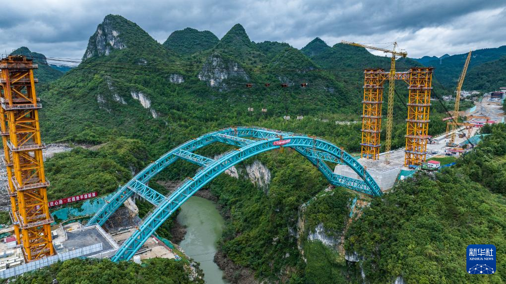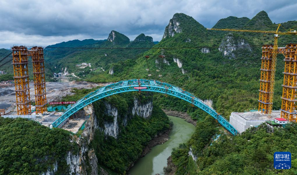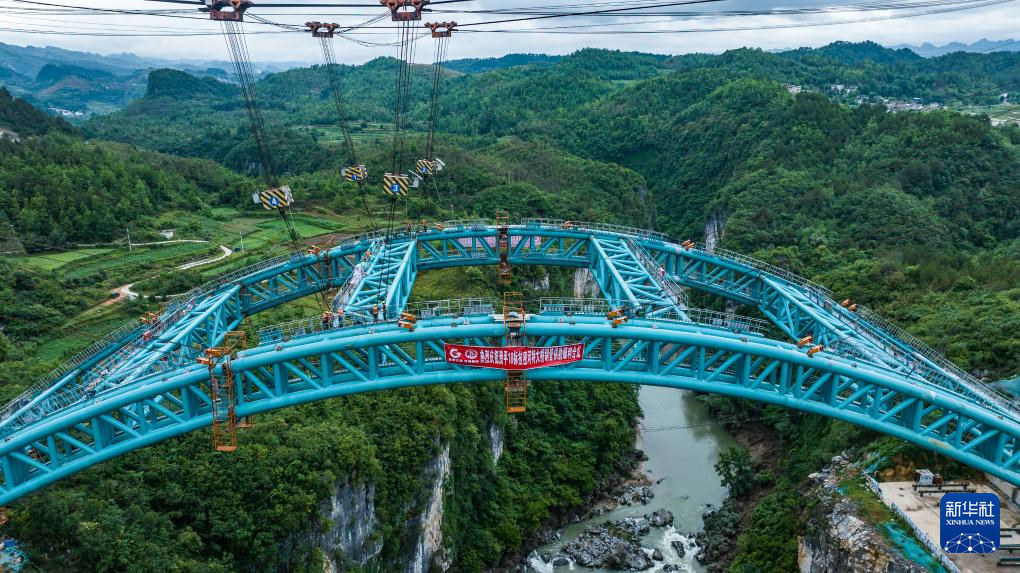拉密河特大桥钢管拱肋合龙现场(5月10日摄,无人机照片)。新华社记者 陶亮 摄