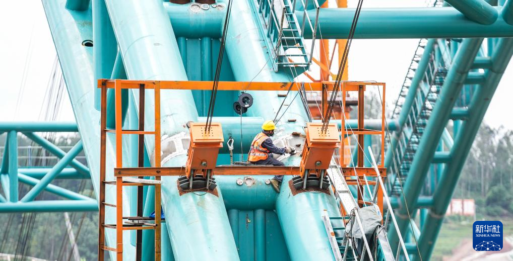 5月10日,工人在拉密河特大桥钢管拱肋合龙现场进行施工。新华社记者 陶亮 摄pagebreak