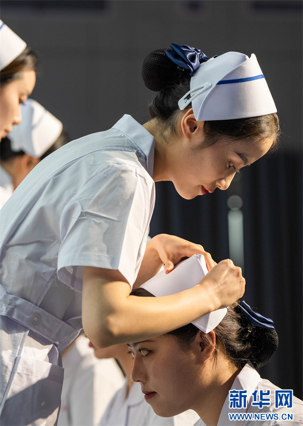 5月11日,贵州省毕节市七星关区人民医院碧海院区举行庆祝护士节活动,图为护士授帽仪式。新华网发(罗大富 摄)