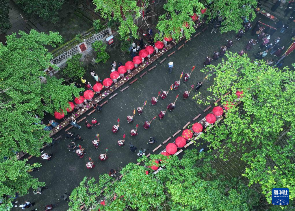5月15日,苗族同胞身着盛装在贵州省黔东南苗族侗族自治州黄平县飞云崖景区参加“四月八”巡游(无人机照片)。