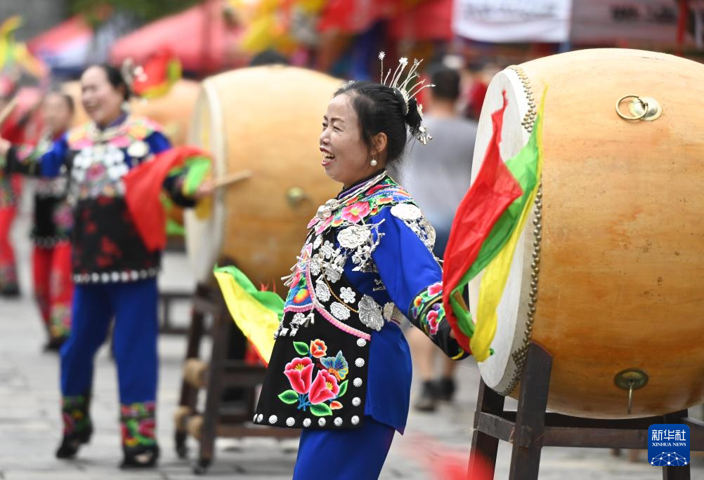 5月15日,在贵州省铜仁市松桃苗族自治县正大镇苗王城景区,苗族同胞在打花鼓。新华社发(谢慧芳 摄)pagebreak