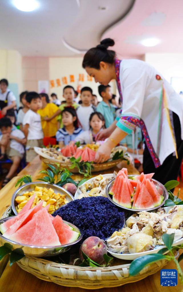 5月15日,小朋友在贵州省黔东南苗族侗族自治州从江县贝贝佳幼儿园迎“四月八”活动上品尝美食。新华社发(卢忠南 摄)pagebreak