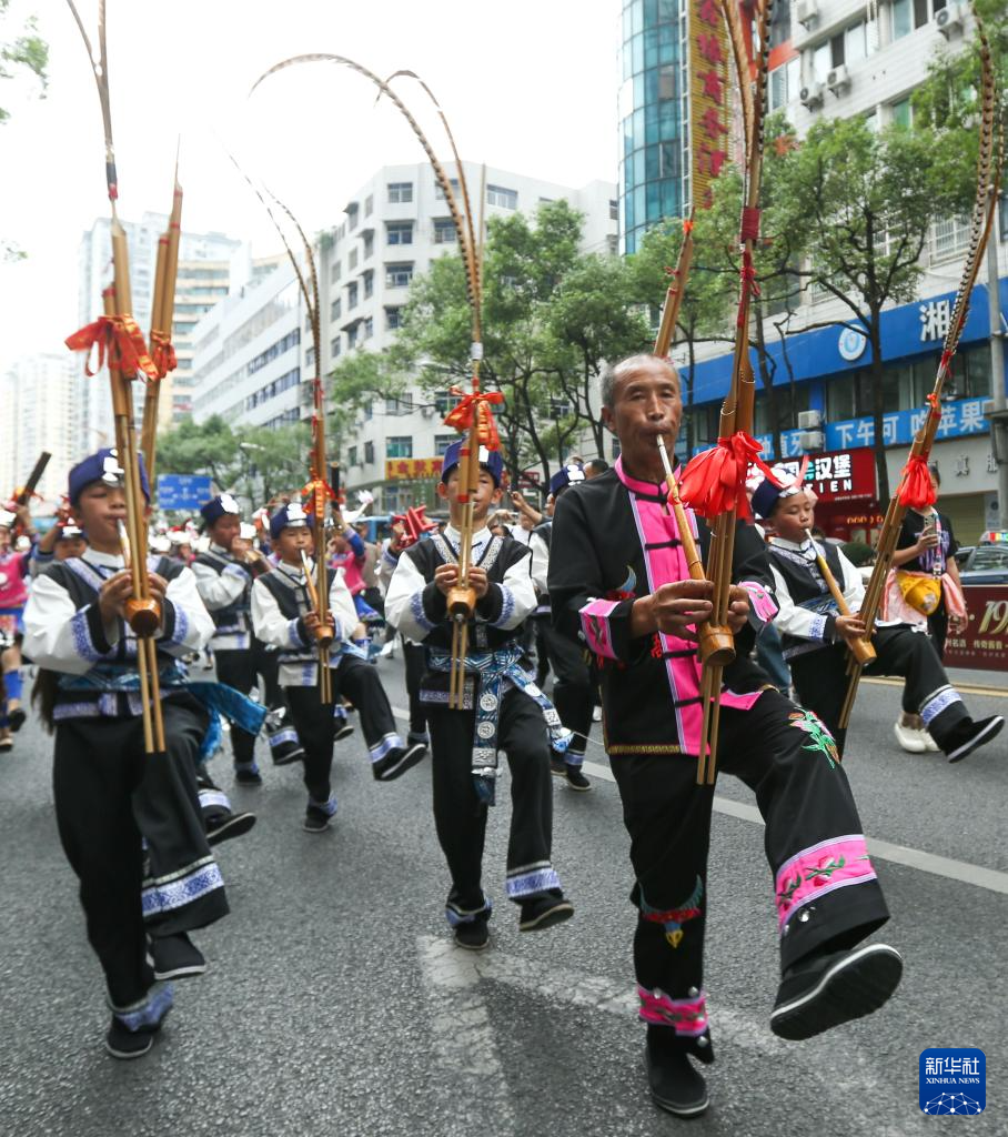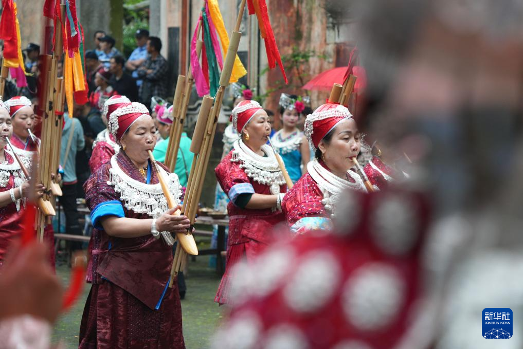5月15日,少数民族群众在贵州省黔南布依族苗族自治州都匀市表演芦笙舞。新华社发(肖伟 摄)
